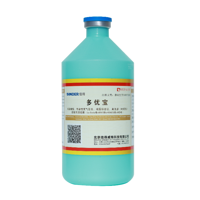【Componentes principales y contenido】 Contenido por dosis (0,5ml): Inactivado Virus de la enfermedad de Newcastle Cepa La Sota ≥108.5identificación electrónica50/dosis, cepa M41 del virus de la bronquitis infecciosa ≥106.5identificación electrónica50/dosis, virus del síndrome de caída de huevo cepa HSH23 ≥1000HA, virus de la influenza aviar (subtipo H9, cepa WD) ≥107.5identificación electrónica50/dosis.